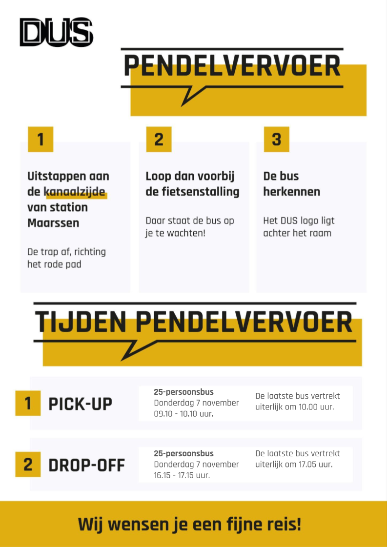 Vanaf station Maarssen kan je gebruik maken van een pendelbus naar de eventlocatie. Deze bus rijdt 's morgens en 's middags 3 keer heen en weer tussen het station en DUS.